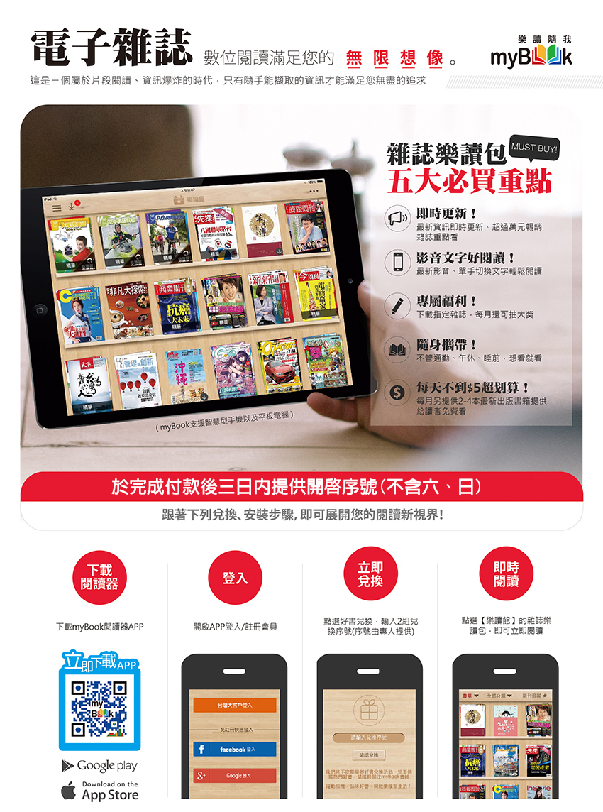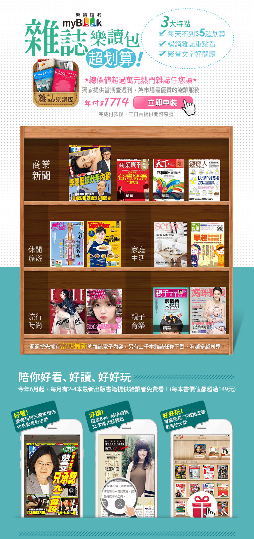 台灣大哥大 myBook 雜誌樂讀包,雜誌種類豐富,輕鬆掌握商業資訊、 國際脈動,近千本雜誌《中文電子版》隨心暢讀,每天不到新台幣$5,連一本雜誌的錢都不到,就可以享用清單上的書目,最適合對雜誌有重度喜好的您!